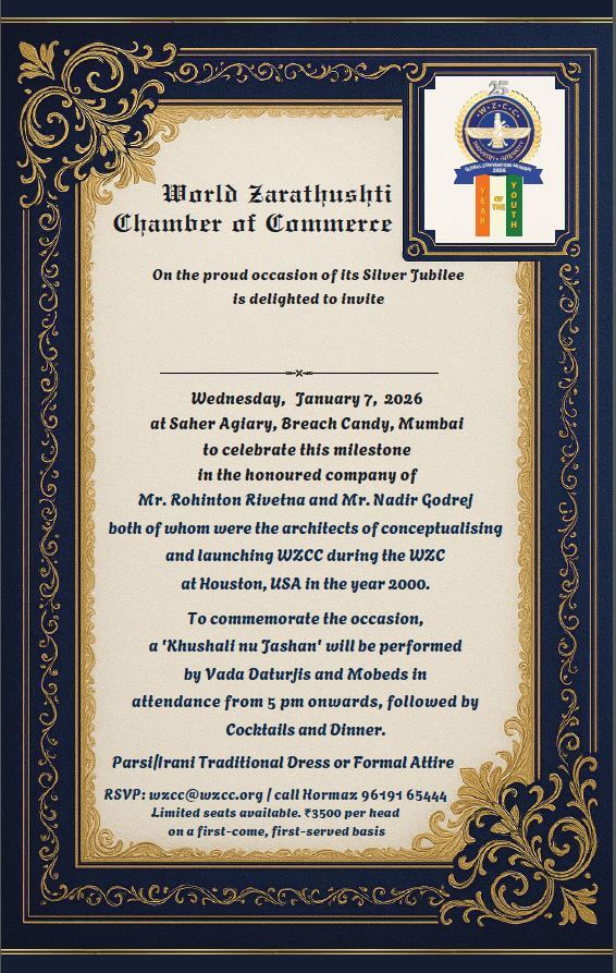 WZCC which was launched in the year 2000, completes 25 years of service to the community in the year 2025. We have therefore decided to celebrate the Silver Anniversary during the Global Convention to be held in Mumbai, India from 8 th to 10 th January 2026. It has been decided to hold a Celebratory Jashan Ceremony on 7 th January’ 2026 at the Saher Agiary at the hands of Wada Dasturji’s. After the Jashan ceremony, we will have a photography session for all delegates where they will be presented with their portraits as a memory of WZCC 25 years. This will be followed by Cocktails and dinner at the same venue where we will be honouring those who have served WZCC over the years. The Chief guest for this function will be Rohinton Rivetna, who is the founder member and also Mr. Nadir Godrej, who will be the Guest of Honour, as he launched WZCC on 28 th Dec’ 2000 during the World Zorastrian Congress at Houston. Besides a few invitees, we are throwing open this event to all our life members and guests who want to participate and celebrate this wonderful occasion. This event will be in a traditional Parsi attire. The charges for those who want to attend will be on the website. We look forward to early bookings as there is a limited capacity at Saher Agairy.